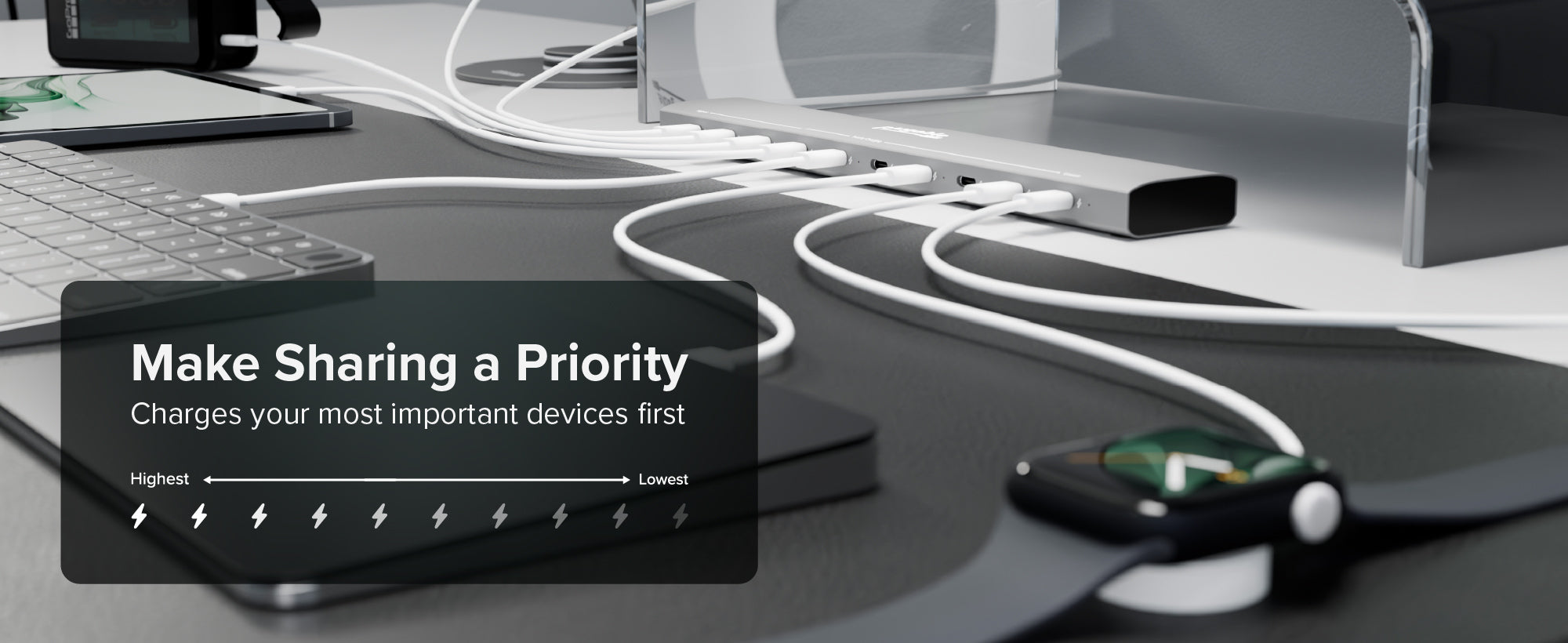 - PriorityShare smart charging moves power from left to right so the devices that need it most finish first