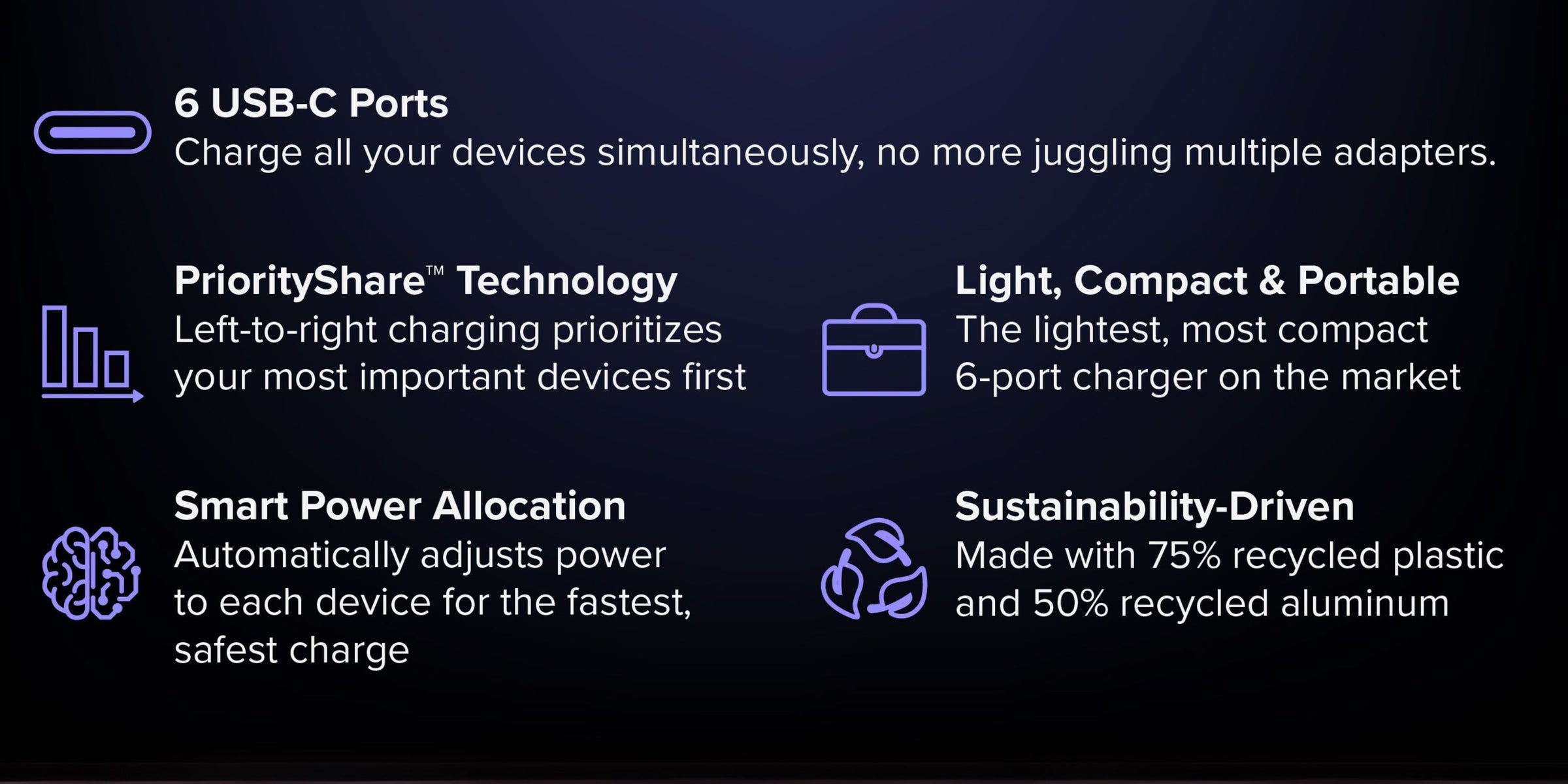 At the heart of the PS-6CC is PriorityShare™, a patented smart-charging system that senses real-time current needs and prioritizes power distribution from left to right. Devices plugged into the leftmost ports receive power first, ensuring laptops, tablets, or other high-priority gear get charged immediately. As those devices reach full charge, power is automatically reallocated to the next devices in line, optimizing charging efficiency across the board without throttling performance.